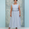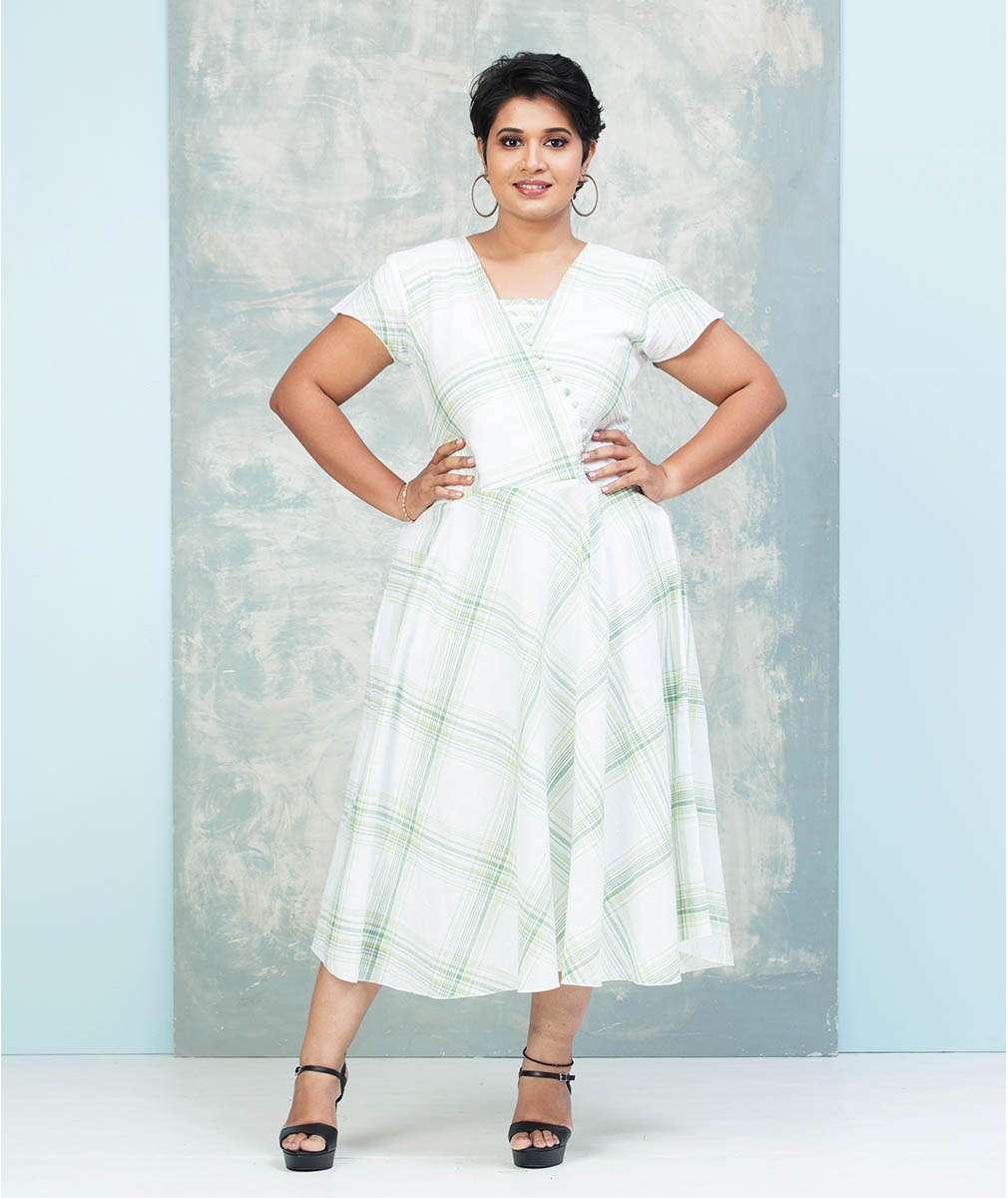 This A-line dress showcases a regular style and features Kantha work detail. It has a calf-length cut with a flared hem, crafted from machine-woven cotton fabric