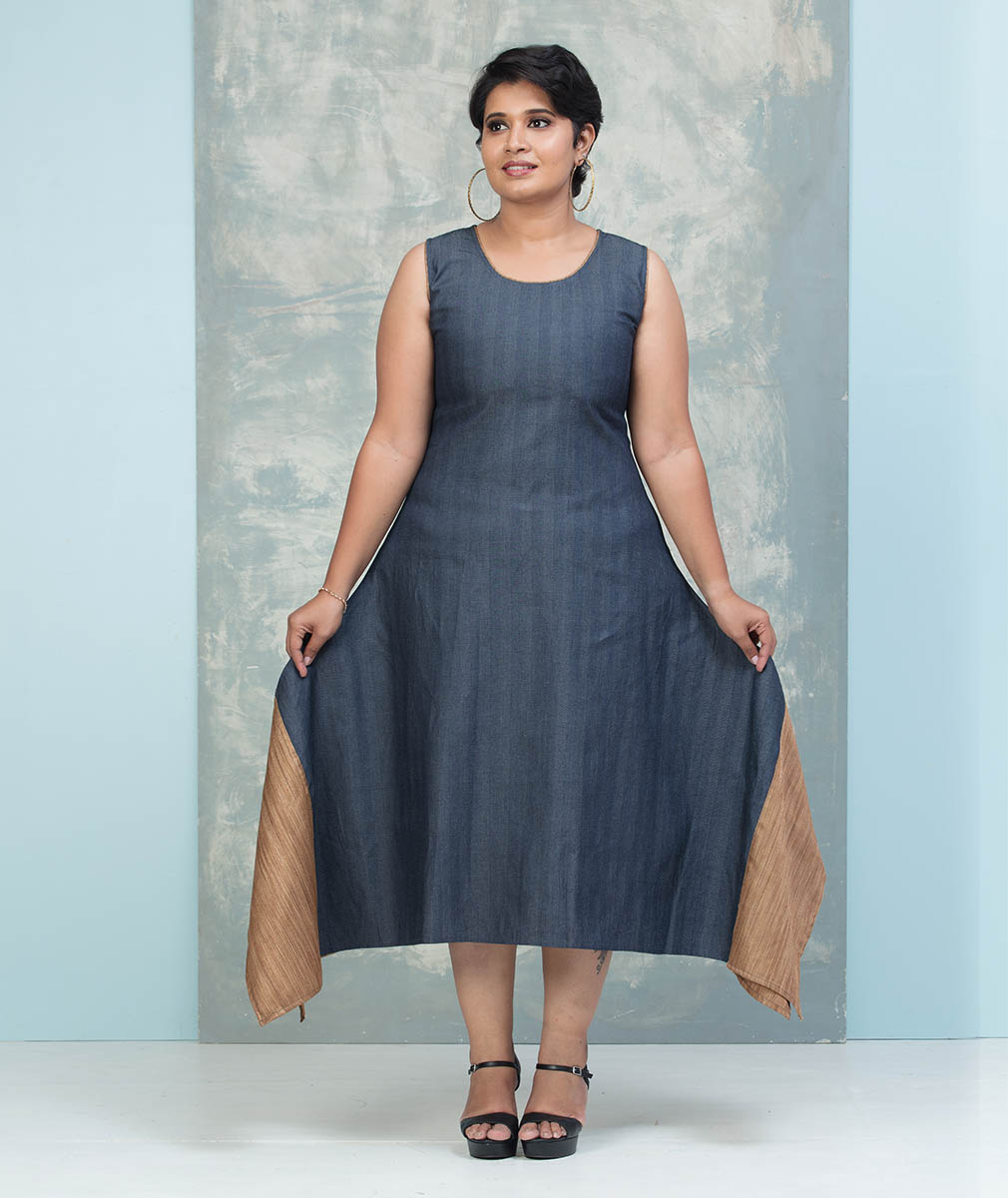 With a floral print and sleeveless, this A-line dress showcases a regular style and features Kantha work detail. It has a calf-length cut with a flared hem, crafted from machine-woven cotton fabric