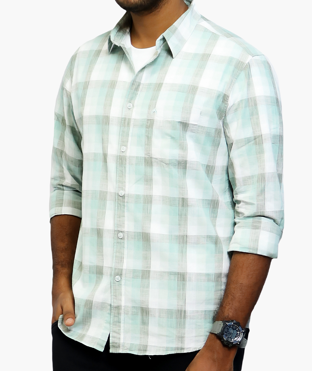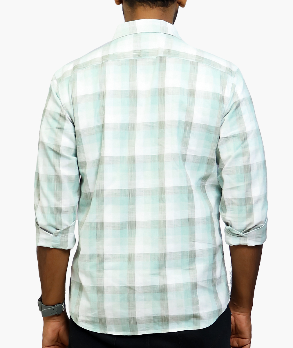 This green checkered shirt, with a white secondary color, features a spread collar, button closure, and full sleeves. Made from a cotton blend, it offers a regular fit and has a curved hem. It is not reversible and is suitable for western wear. For fabric care, machine wash as per the tag.