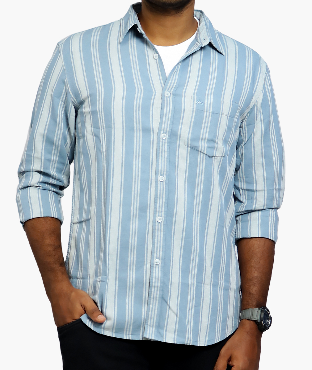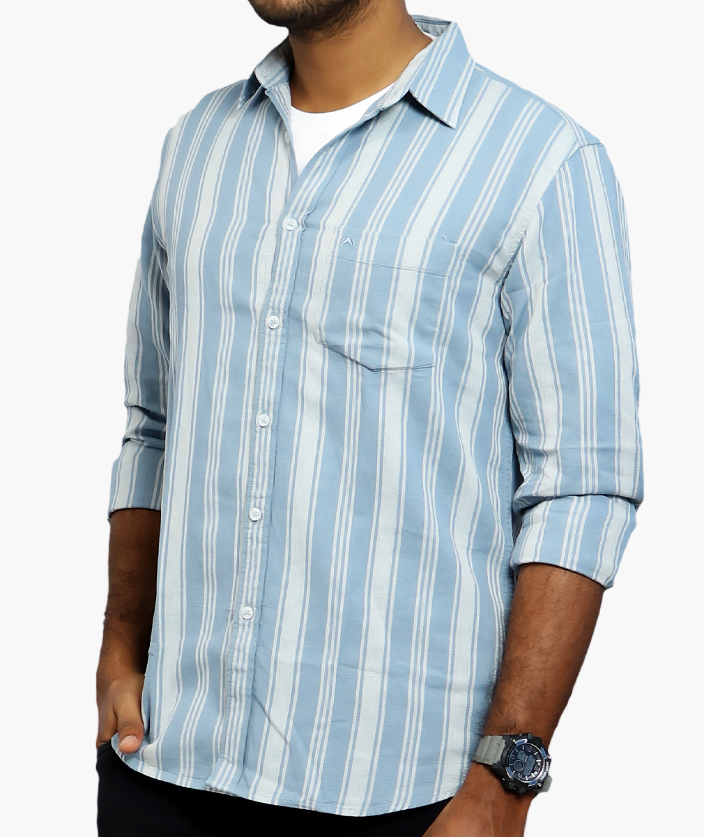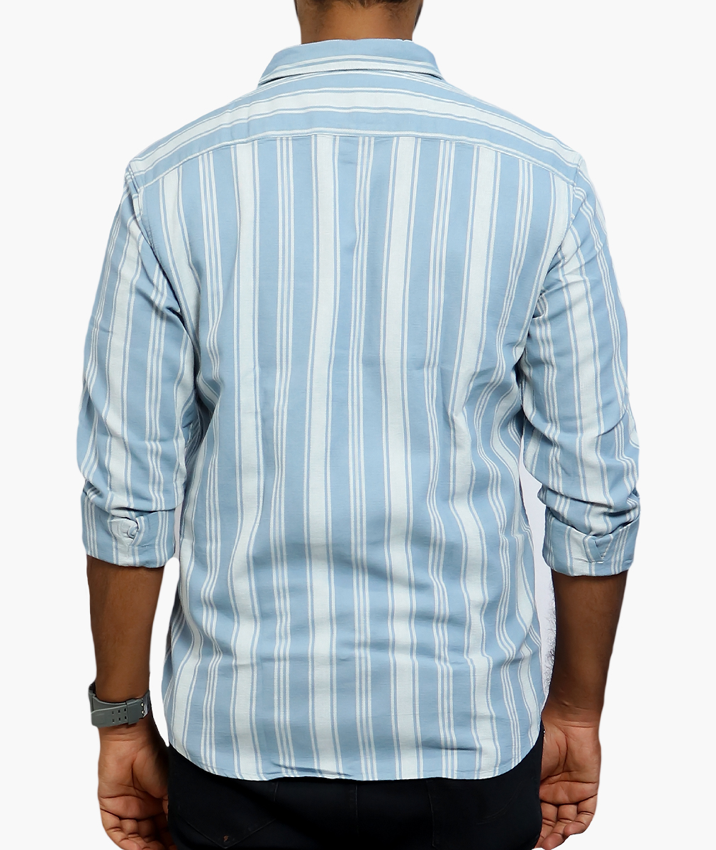 A blue and white vertical striped opaque casual shirt with a spread collar, button placket, patch pocket, long roll-up sleeves, and a curved hem.