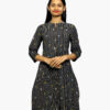 This blue dress features ethnic motifs printed throughout, a keyhole neckline, three-quarter regular sleeves, and a straight shape with a regular style. It is detailed with beads and stones, finishing at calf length with a straight hem, all made from machine-woven regular cotton.