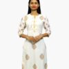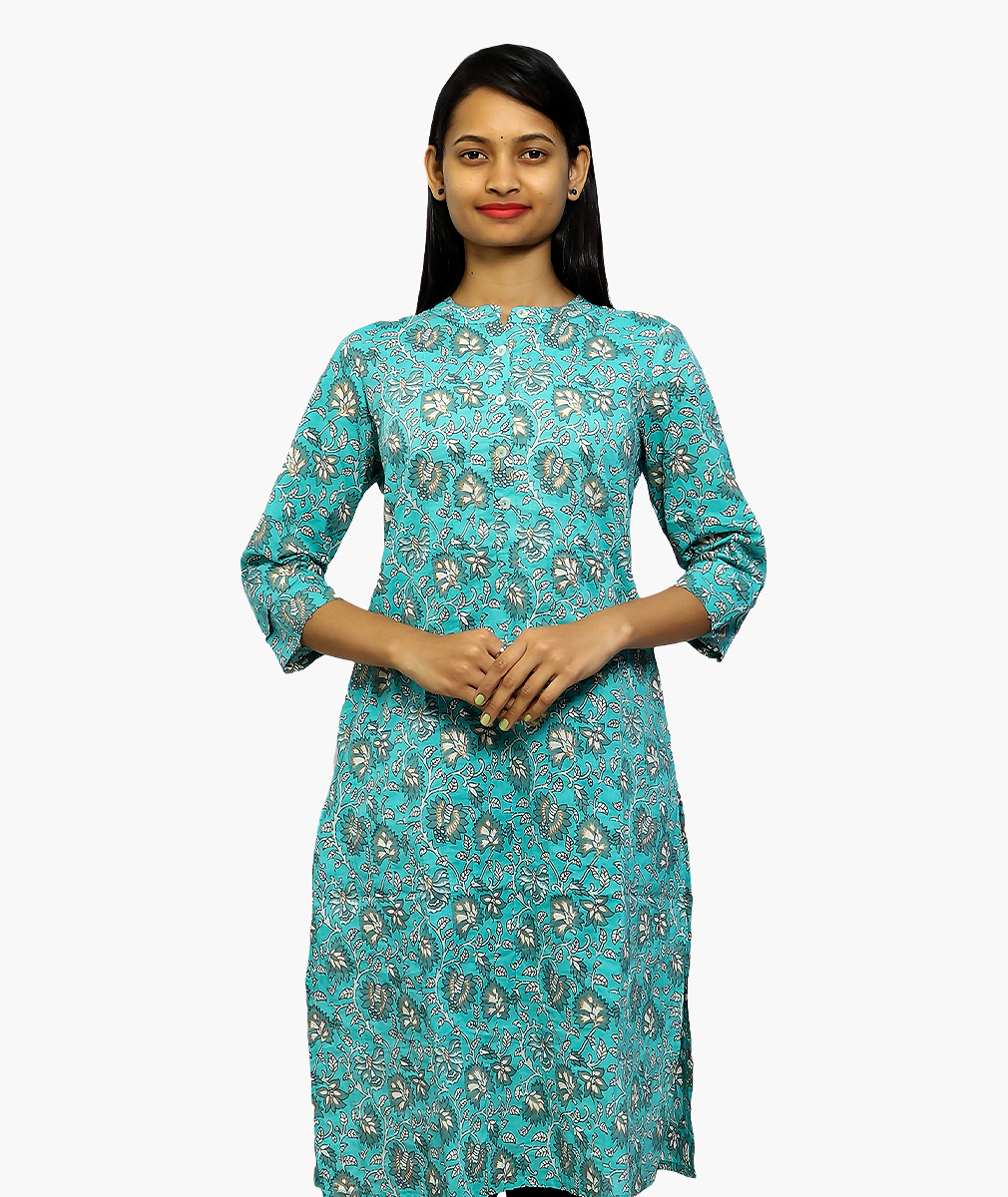 Women Blue Ethnic Motifs Printed Keyhole Neck Cotton Kurta with Pocket (3/4 sleeve)