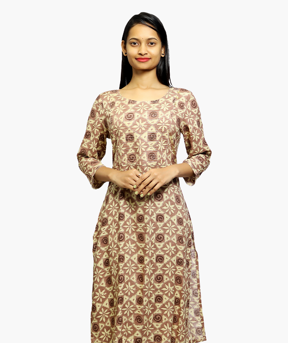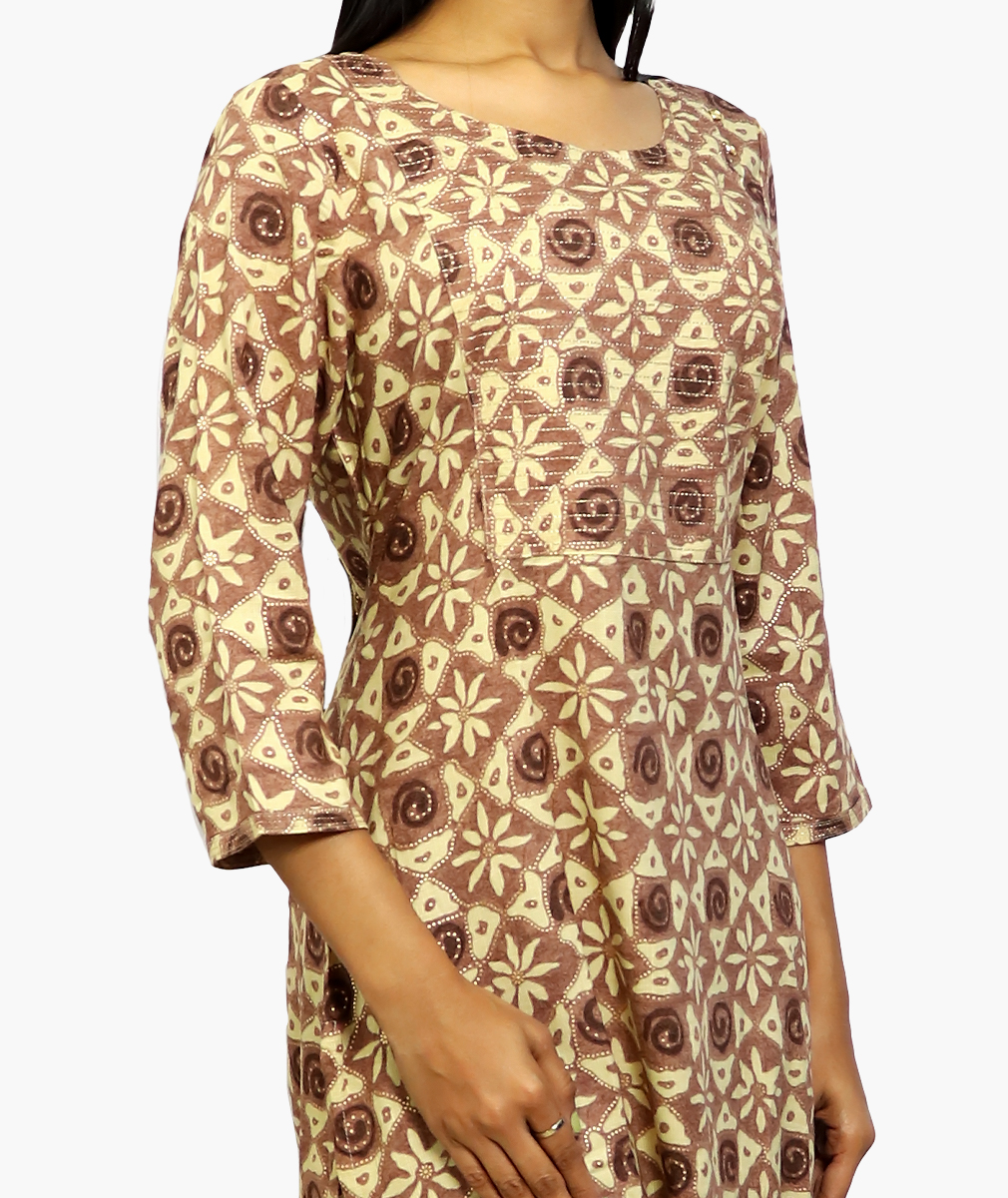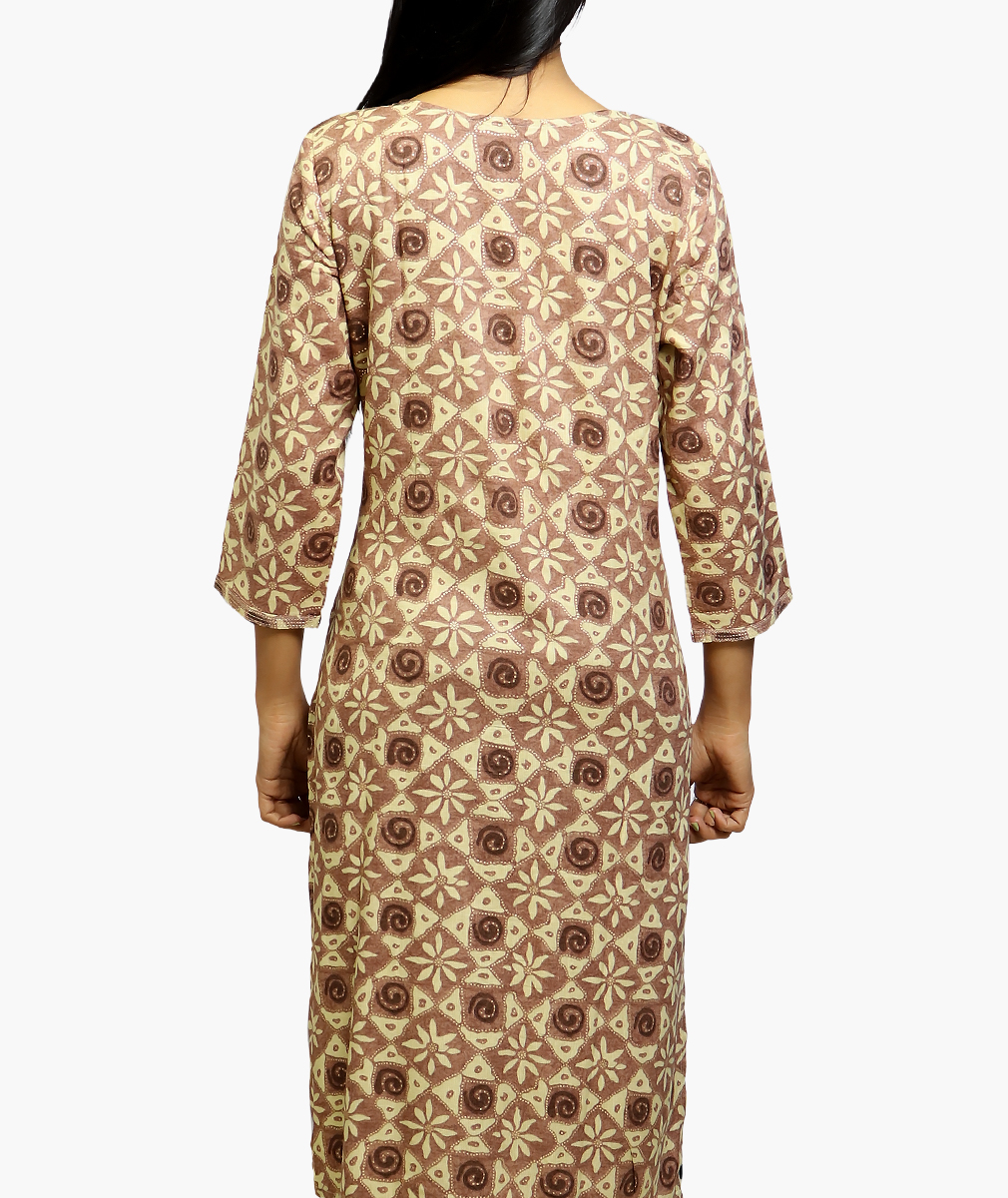 Women Geometric Print Round-Neck Straight Cotton Kurta (Brown – 3/4 sleeve)